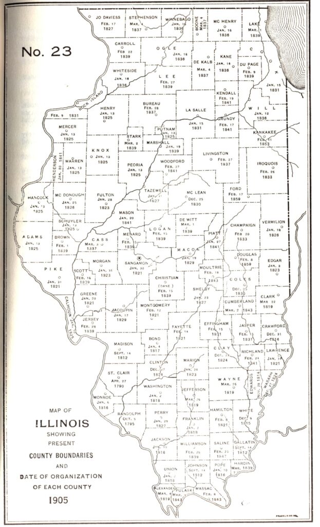 The remaining 18 counties of Illinois were founded from 1841 to 1859, which averages out to one new county a year during that period. However, the establishing of those 18 counties didn’t happen that regularly, for seven of them were established in 1841: Grundy, Henderson, Kendall, Mason, Piatt, Richland, and Woodford counties.