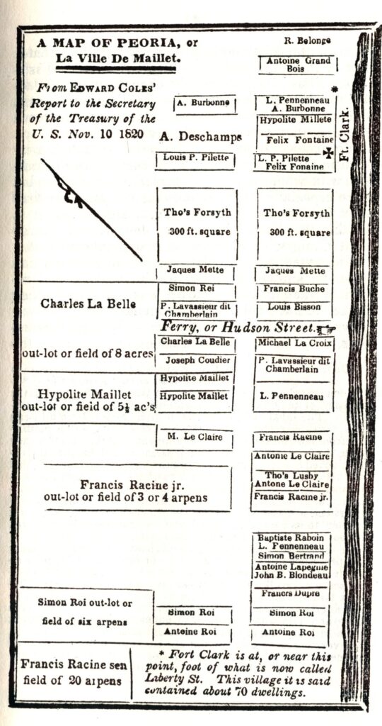 The small village that grew up around Maillet’s cabin moved upriver to the future site of Peoria in 1778, growing to become a town and flourishing as a trading link between Canada and the French settlements on the Mississippi until the War of 1812. During that war, the town was destroyed in an attack that American militia forces of the Illinois Territory launched against the Indian tribes around Peoria Lake. Although the townsfolk were U.S. citizens, they were taken prisoner and carried off to southern Illinois – but a few returned to Peoria Lake after the War of 1812.