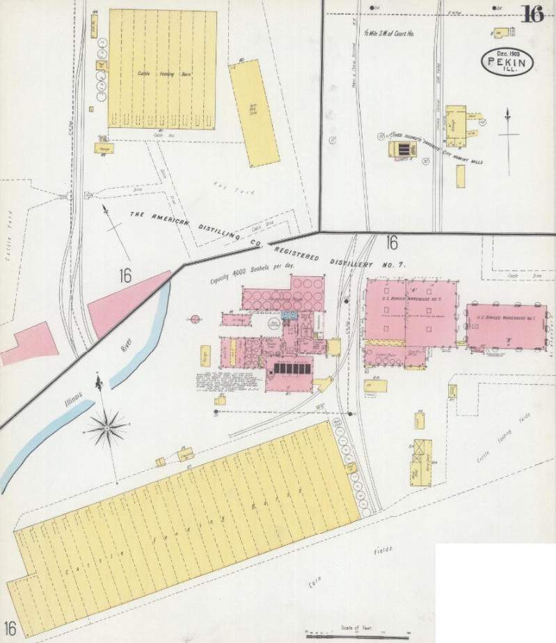 The American Distilling Co. on Front Street in southwest Pekin is shown in this Nov. 1903 Sanborn Fire Insurance map.