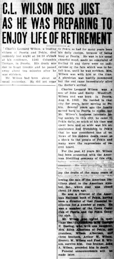 Toward the end of his life, Charles lived at 1505 Columbia Terrace in Peoria. That is where he was when suddenly died of a massive heart attack on the night of 4 May 1928, just 10 day after American Distillery was sold to new owners and Charles was preparing to enjoy his retirement. He, his wife Georgia, their daughter Edith, and their son-in-law Frederick are all buried in the Wilson family plot in Springdale Cemetery, Peoria.