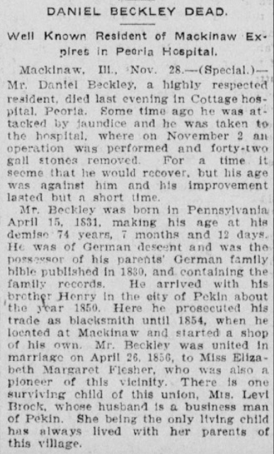 Daniel Beckley Jr. lived out the remainder of his days in Mackinaw, dying at the age of 74 on 27 Nov. 1905 at Cottage Hospital in Peoria of gall bladder and liver disease. His wife Elizabeth survived him by 14 years, dying from complications of a stroke on 11 Dec. 1919. They, their daughter Lora, and Lora’s husband Levi are buried together in Mackinaw Township Cemetery. Daniel Jr.’s obituary follows below: