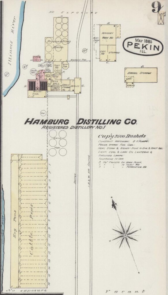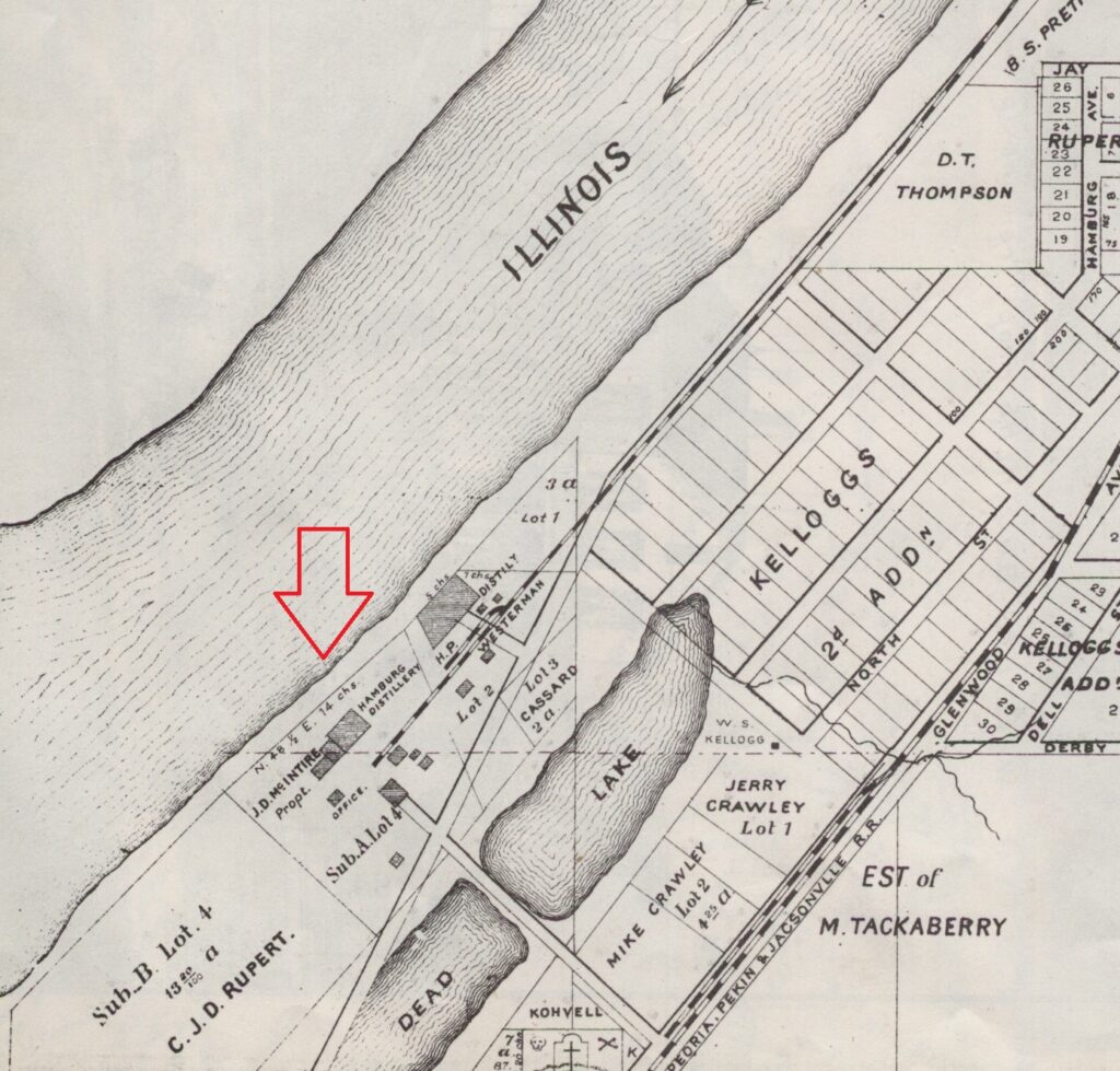 After that setback, in 1855 William and his family moved to Peoria, Illinois. Three years later, in 1858, he built Pekin’s first distillery, the Hamburg, on South Front Street at the southern Pekin city limits. He was the proprietor of the Hamburg Distilling Co. for only a few years, because by the time of the 1861 Pekin city directory ownership of the Hamburg had passed to Columbus J. Day Rupert (c.1826-c.1882), son of prominent Tazewell County pioneer Gideon H. Rupert. The 1861 directory’s entry for Rupert says, “RUPERT C. J. D., proprietor Hamburg Distillery, southern extension Front; office, southwest cor. Third and St. Mary.“