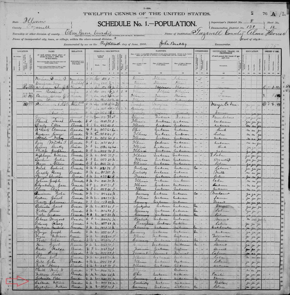 Though the above biography paints a picture of success, in fact William’s life was on the verge of utter ruin. By the time of the 1900 U.S. Census, he was a boarder at the Tazewell County Alms House east of Pekin in Elm Grove Township. Suffering the physical and psychological effects of many years of alcohol abuse, William was sent to the Alms House in the mid-1890s — around the same time that his 1894 biography was published.
