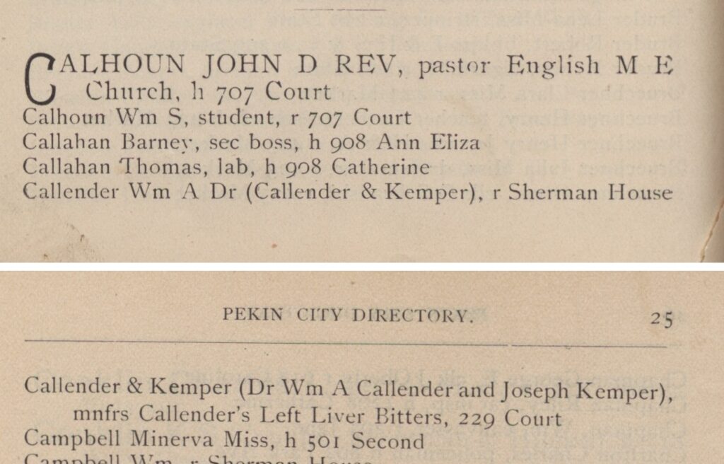 On 1 Aug. 1892, William moved back to Pekin, bringing the Callender’s Celebrated Left Liver Bitters recipe with him. The 1893 Pekin city directory says that he then resided at the Sherman House hotel at the northeast corner of Second and St. Mary streets. His business partner was Joseph Kemper, and the firm was thus known as Callender & Kemper, located at 229 Court St.
