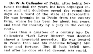 While in Peoria, he patented an alcohol- and vegetable-based tonic that he named the “Callender Left Liver Bitters,” a substance he compounded and peddled in Peoria for the next 20 years. It was also in those days that he became “Dr.” William A. Callender, though it is unclear what medical training, if any, he actually had. According to Dr. Callender, the Callender Left Liver Bitters were “the only bitters that are warranted to cure all diseases of the liver, stomach and blood.” Of course his rivals in the bitters tonics business — which was quite lucrative in the decades from about 1860 to 1905 — made the same claims for their “medicine.” Considering the kinds of purported remedies and cures that were commonly peddled in the 19th century, Dr. William Callender’s Left Liver Bitters were no doubt much more likely to cause, rather than cure, diseases of the liver, stomach and blood.