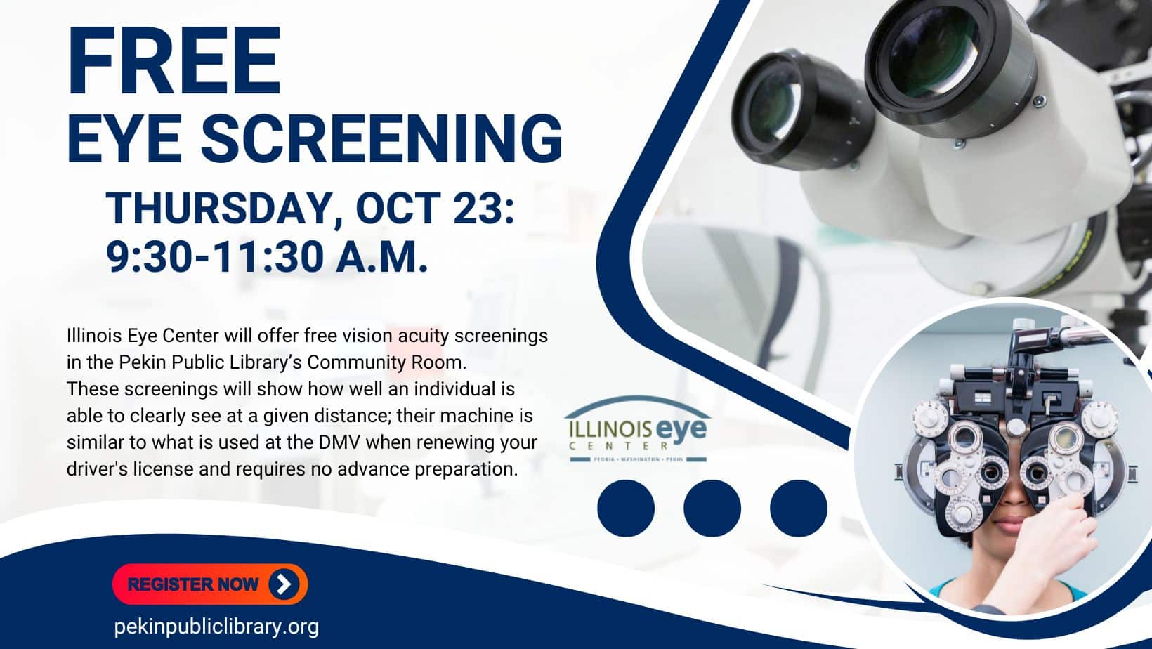 Illinois Eye Center will offer free vision acuity screenings in the Pekin Public Library’s Community...