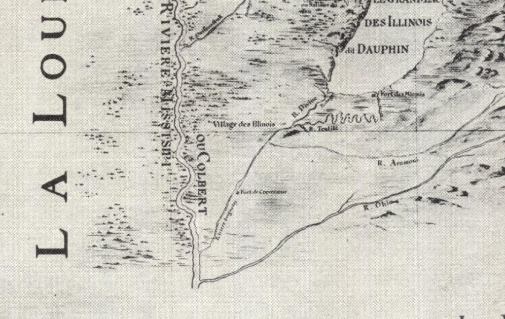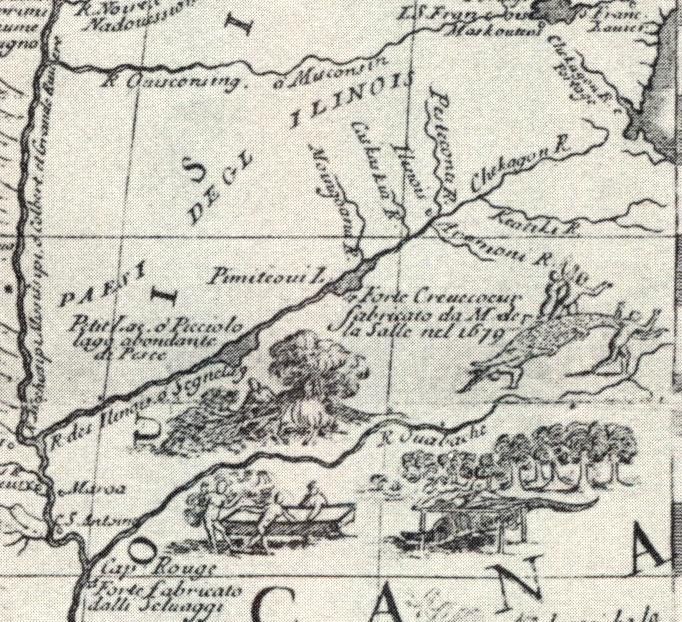 Rare, early maps of the area show both Lake Pimiteoui and Fort Crevecoeur, but not in enough detail to ascertain the precise location of the fort. One of the earliest of those maps was drawn up in 1688 by Jean-Baptiste Louis Franquelin, who had served as La Salle’s draftsman in France in 1684. Franquelin’s 1688 map was ultimately based on a lost map drawn up by La Salle himself. Fort Crevecoeur and Pimiteoui Lake are also noted on Marco Vincenzo Coronelli’s 1688 map of North America. Coronelli got his information about Fort Crevecoeur from La Salle’s own 1682 Relation Officielle of his discovery of the mouth of the Mississippi River.