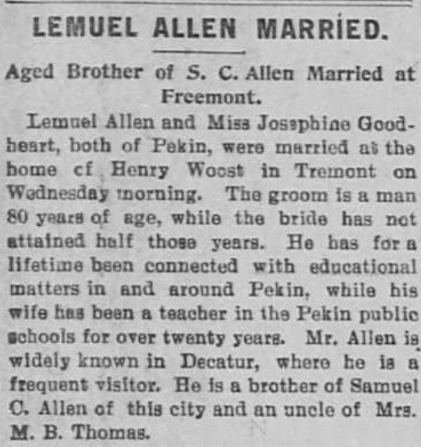 Allen never had any children of his own, but he was twice married. His first wife, whom he married in Decatur on 14 Sept. 1843, was Margaret (Robinson) Pratt (1803-1894), daughter of Col. John Robinson of Pickaway County, Ohio, and widow of William Pratt, a native of Maryland who had died in 1841. William and Margaret had a daughter — Lemuel Allen’s step-daughter — named Annie A. Pratt (1834-1907). In 1893, Lemuel and Margaret celebrated their golden wedding anniversary, but Margaret passed away the following year on 7 July 1894 at the age of 90. Four years later, on 28 Dec. 1898 in Tremont, Lemuel remarried to Miss Josephine Goodheart (1854-1922), a long-time Pekin school teacher who had been member of Pekin Community High School’s first graduating class, the Class of 1873, later becoming the high school’s principal.