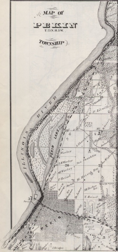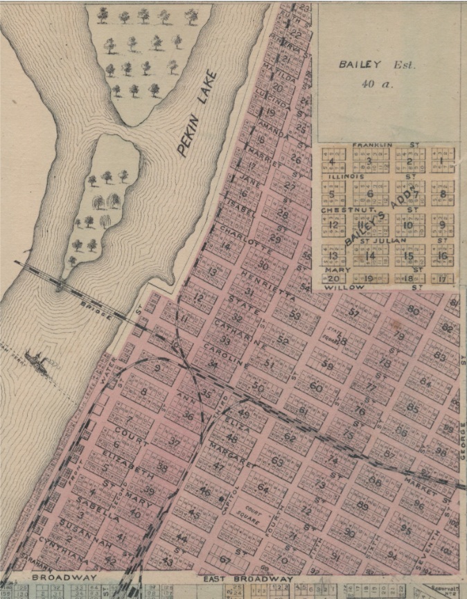 As the timeline above shows, it was almost 202 years ago that Jonathan Tharp built his log cabin at a spot that is today the foot of Broadway – the seed of the pioneer village that would become the City of Pekin. Many of the events pertaining to the early settlement and planning of Pekin have been documented in books, newspapers, and photographs, but a great many of those events have been forgotten – and even what has been recorded often suffers from gaps of detail that might be of interest to us today but didn’t seem important enough to our ancestors to record.