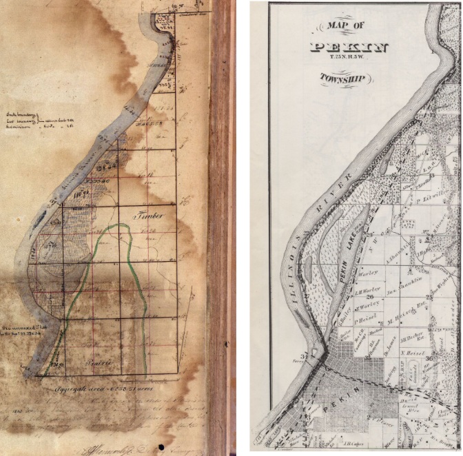 In 1823, federal surveyors went to work on conducting official surveys of Illinois’ congressional townships. From their surveying field notes, a series of formal township plats were drawn up, which may be studied at the website of the Illinois State Archives. Here below is an 1835 hand-drawn federal plat of the congressional township that would later be named “Pekin Township,” followed by further plats from the 1840s, 1850s, and 1870s. Note that the 1835 plat dates from only five years after the founding of Pekin.