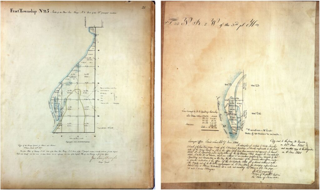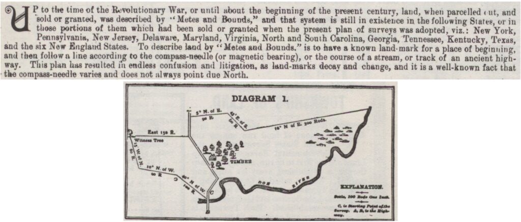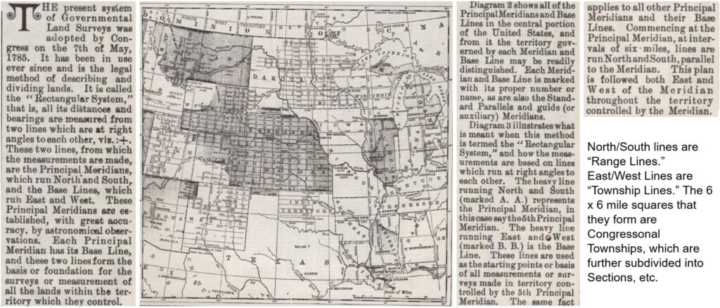 Two of the events or developments outlined above had direct bearing on the surveying, mapping, and platting of Pekin and its environs. The Land Ordinance of 1785 formally replaced the old “metes and bounds” method of determining property boundaries with a scientific surveying and platting method that had been developed over the previous century or so. Instead of “metes and bounds,” Congress directed that the Northwest Territory (including what would become Tazewell County and Pekin) would be surveyed into “townships” using a “Rectangular System” that relied on geographical coordinates of intersecting lines of latitude and longitude — “Meridians” and “Base Lines.” The difference between those two surveying systems was explained in the 1891 Tazewell Count atlas, as excerpted below: