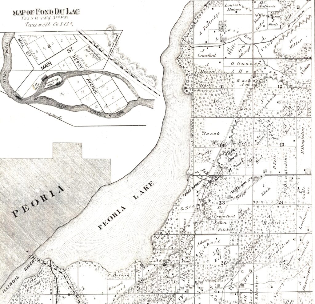 Three years after William Blanchard’s arrival at Fort Clark, he and a few companions crossed Peoria Lake to present-day Fon du Lac Township in Tazewell County, building a dwelling and growing crops south of the future Woodford County border. Here is how Chapman told the story of Blanchard’s earliest pioneer activities: