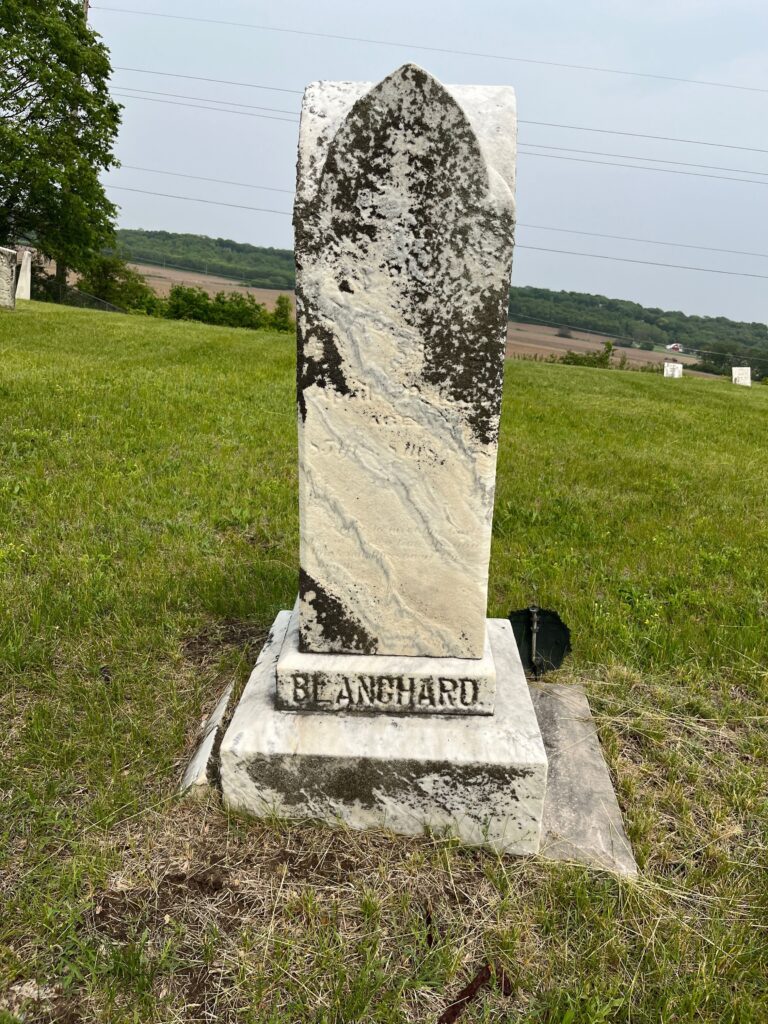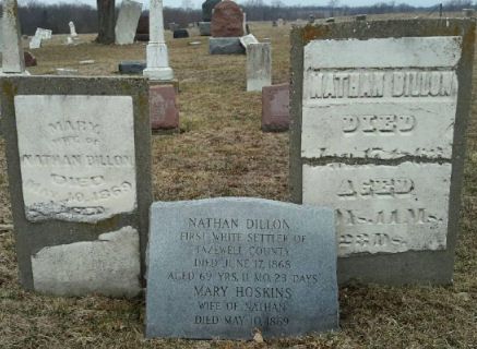Dillon has traditionally been called Tazewell County’s first white settler, but he arrived here a year after Blanchard and long after the Frenchmen of Opa Post. The confusion arose from the haste with which Chapman’s 1879 Tazewell County history was compiled and edited – Chapman didn’t learn that Blanchard preceded Dillon until the printing of his book was underway, so Chapman’s book at first states that Dillon was the earliest, then later on, when telling of Blanchard’s 1822 arrival in the future Tazewell County, the book corrects and apologizes for that error. The monument at Dillon’s grave erroneously pronouncing him the county’s first white settler stems from Chapman’s mistake. (Nathan’s original gravestone and later monument also mistakenly give his age at death as 69 years 11 months, though Chapman’s account and U.S. Census records affirm that he was born in 1793, not 1798.)