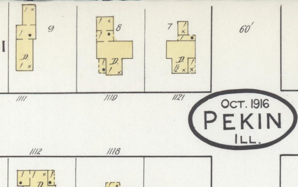 The lot on which this residence is located has the legal description of SEC 35 T25N R5W CASEYS ADDN LOT 5 (EXC N77′) BLK 1 SE 1/4. Thus, 1119 Hamilton is a home in the Casey’s Addition of Pekin, at the north end of a part of the general part of town that colloquially has been known as Bean Town — Pekin’s old German quarter. Tazewell County Assessor’s records say the house was built 1897 — making the house 128 years old — but the address “1119 Hamilton” does not appear in Pekin city directories until 1904. During the first 23 years of the house’s existence, 1119 Hamilton was home to a fairly rapid succession of families, most of them German-Americans, as one would expect for a house in Bean Town.