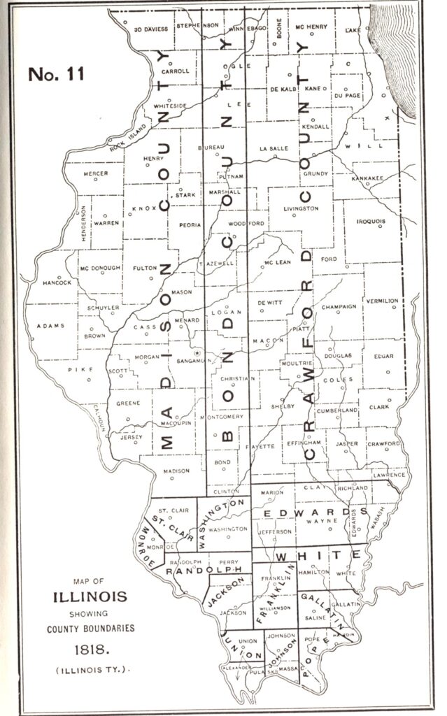 This map, the “Origin and Evolution of Illinois Counties,” shows the boundaries of Illinois’ counties at the dawn of statehood in 1818.
