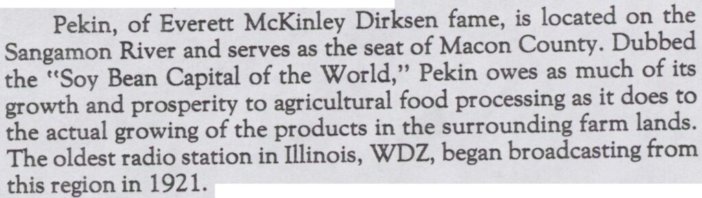 Upon closer investigation, almost everything that Leckel and Feeney said about Pekin are facts about the city of Decatur, Illinois. It is Decatur, not Pekin, that is located on the Sangamon River and is the seat of Macon County. It is Decatur, not Pekin, that has been known as the “soy bean capital of the world. As the home of Archer-Daniels-Midland, it is Decatur that owes much of its growth to agricultural food processing.