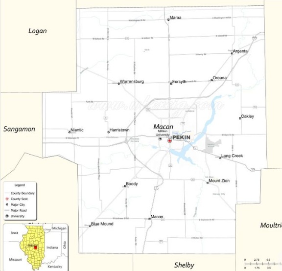 Pekin located on the Sangamon River and the seat of Macon County? That just doesn’t sound right. Let me check a map . . . . Oh. Well, well. Maybe the cookbook is right after all. Perhaps the following map is the one that Leckel and Feeney consulted when researching the “historic lore” of their cookbook: